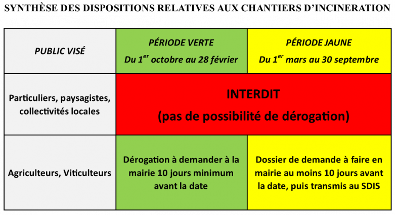 - En période verte (du 01/10 au 28/02) : par le Maire des communes, pour les végétaux émanant de leurs travaux. La demande écrite d’autorisation doit être déposée à la mairie au moins 10 jours avant la mise à feu.